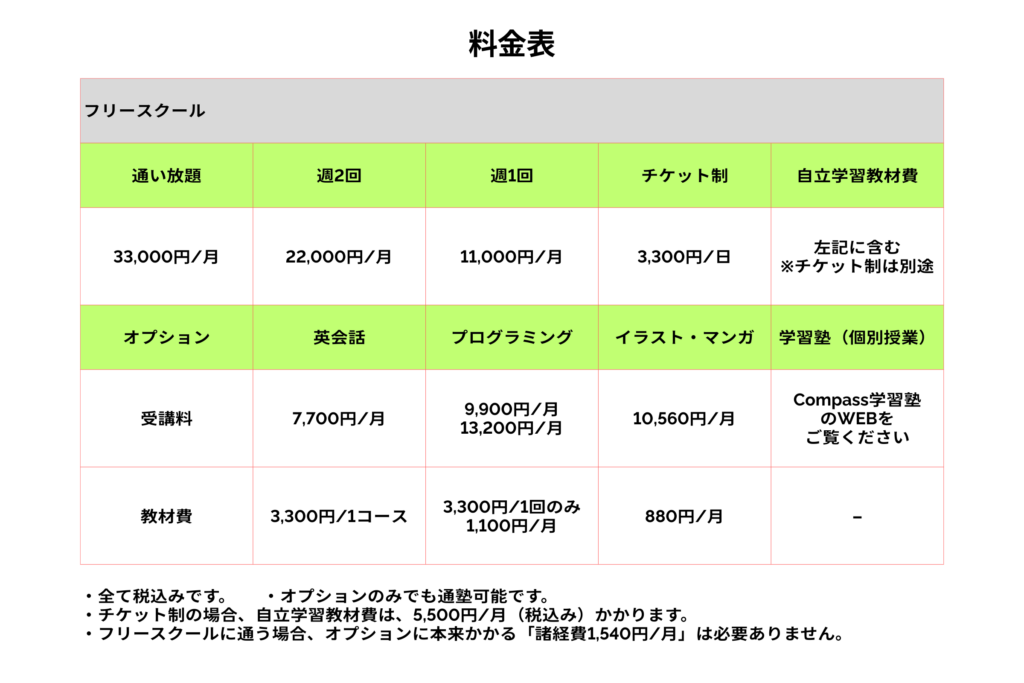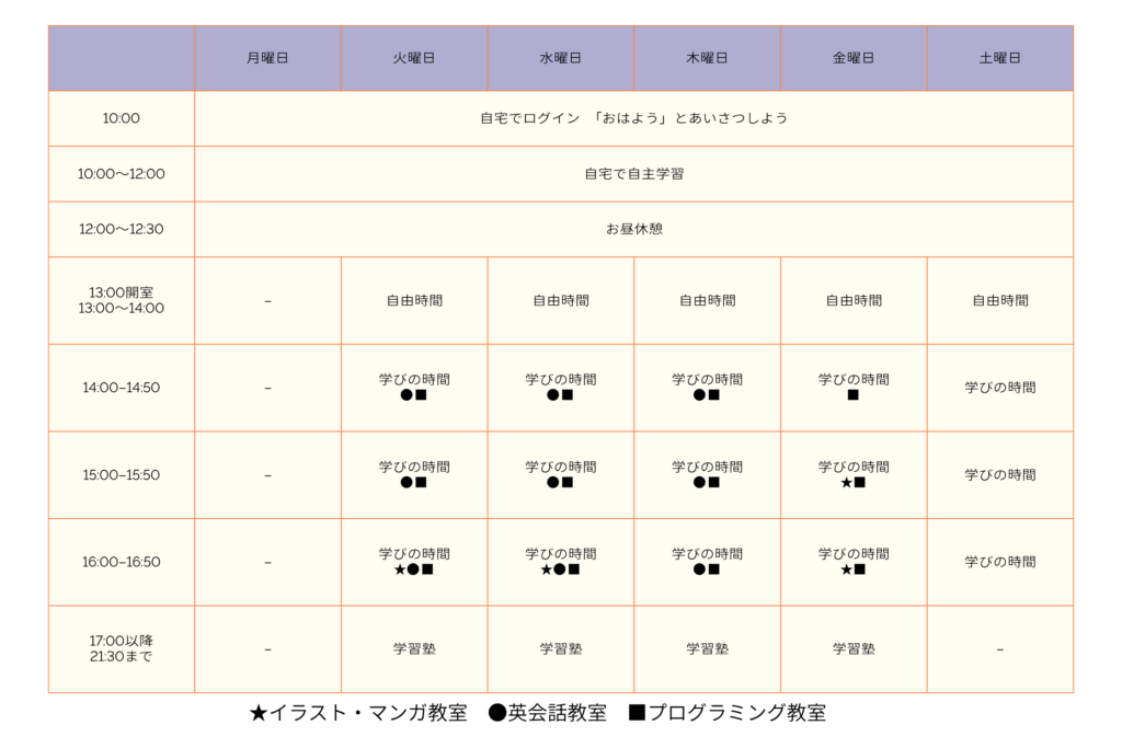 ・必ず、初めから終わりまでいなければならないわけではありません。好きな時間に来て、好きな時間に帰ってよいです。ただし、オプションは原則、曜日時間帯固定でお願いします。