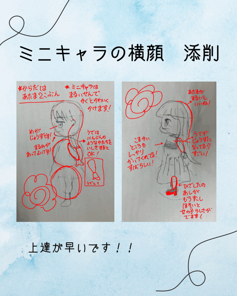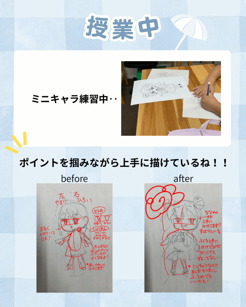 顔の描き方などイラストの基本から、オリジナルキャラクターまでプロの講師が実際に目の前で絵を描きながら、丁寧に教えます。